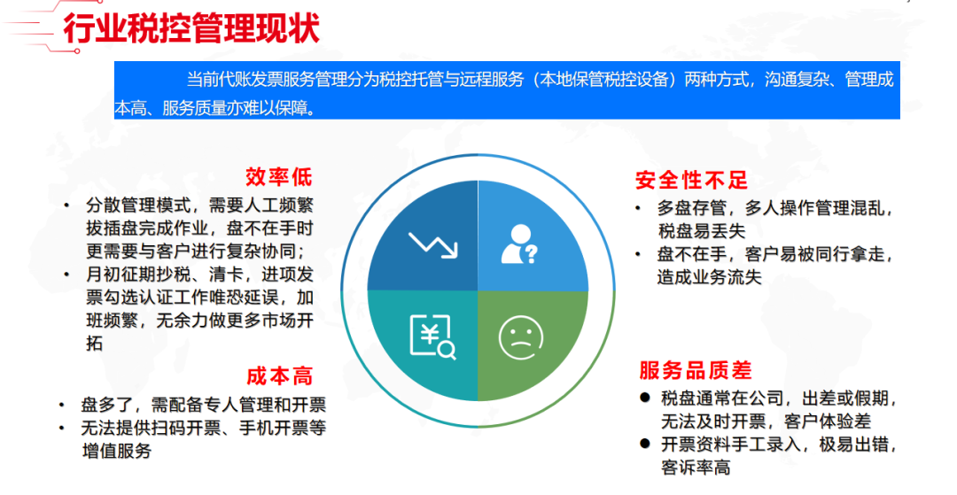 相信大家都有一個共同的認識:“金四”時代的稅收治理必然進入“以數(shù)治稅”階段。在國家監(jiān)管越來越嚴格的同時,也意味著“合規(guī)”的重要性進一步加強,這就要求代代理記賬公司必須對“金稅四期”有著全面而深刻的認識,才能為客戶提供更加專業(yè)而優(yōu)質(zhì)的服務(wù)。 然而,代賬行業(yè)當前發(fā)展瓶頸和未來趨勢。代賬行業(yè)早已從“野蠻生長”的發(fā)展期邁入了“精耕細作”的成熟期,面對愈演愈烈的行業(yè)競爭,代賬機構(gòu)不得不從“客戶存量博弈”轉(zhuǎn)向“價值增量博弈”,而目前傳統(tǒng)模式的代賬服務(wù)還有很大的提升空間。利用數(shù)
