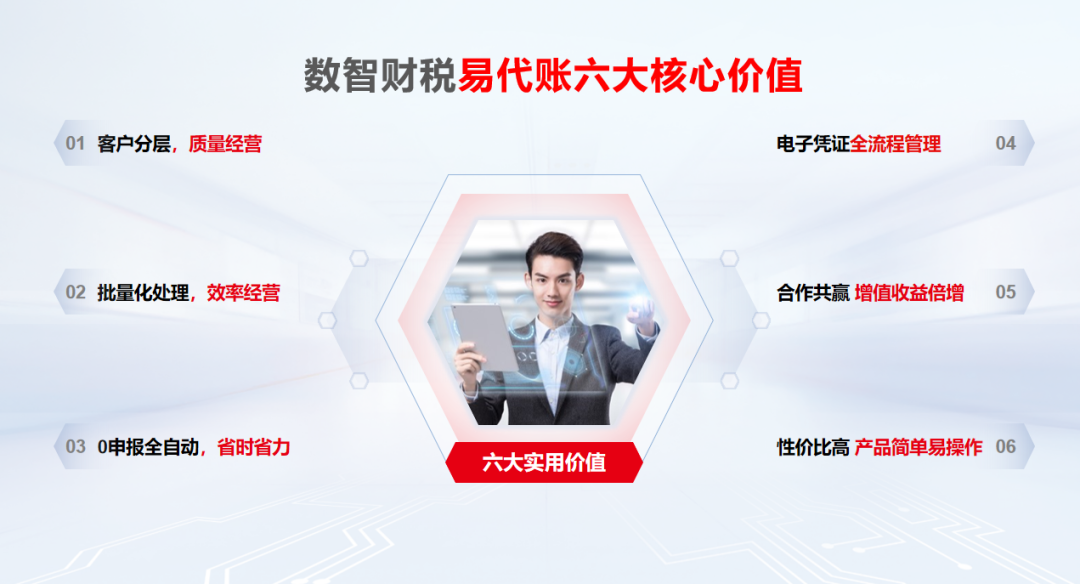 易代賬產(chǎn)品價值點應(yīng)用: 一、數(shù)智財稅易代賬六大核心價值
