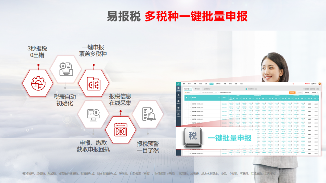 三、多稅種一鍵批量申報 支持稅種:增值稅、附加稅、城市維護建設(shè)稅、教育費附加、地方教育費附加、所得稅、財務(wù)報表(季報)、財務(wù)報表(年報)、印花稅、垃圾費、地方水利基金、社保、個稅等;不支持:匯算清繳、工商年報