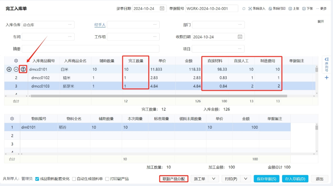 01 多產(chǎn)成品選擇 啟用聯(lián)副產(chǎn)品后,在完工入庫單的產(chǎn)成品上表體可以通過菜單選擇本次一同產(chǎn)出的多成品、殘次品、邊角料等。 02 快捷分配或填寫生產(chǎn)成本 生產(chǎn)成本料、工、費管理,多產(chǎn)成品直接材料的數(shù)量由原材料稻谷的成本決定總和,可以通過多產(chǎn)成品數(shù)量進(jìn)行快捷分配,也可根據(jù)實際情況填寫。 填入人工和制造費用根據(jù)情況(如果制造費用和直接人工數(shù)據(jù)在生產(chǎn)完工時未統(tǒng)計出,也可以在后期進(jìn)行多次分?jǐn)偅?/span> 03 多產(chǎn)成品數(shù)量 依據(jù)實際產(chǎn)出數(shù)量直接填寫多產(chǎn)成品數(shù)量。