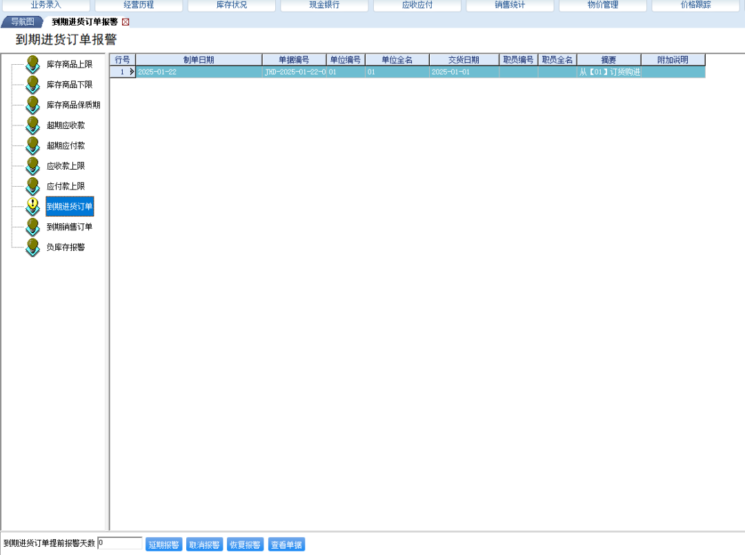 發(fā)表時(shí)間:2025-02-24 12:26作者:小管君 ![]() 摘要 訂單超期預(yù)警在供應(yīng)鏈管理和銷(xiāo)售交貨準(zhǔn)時(shí)性方面發(fā)揮著關(guān)鍵作用,超期進(jìn)貨訂單提前預(yù)警可以幫助企業(yè)優(yōu)化供應(yīng)鏈管理流程。超期銷(xiāo)售訂單提前預(yù)警可以幫助企業(yè)確保交貨準(zhǔn)時(shí)。 輝煌 II 、輝煌erp 、云輝煌 、云輝煌 II 和云輝煌 erp系列是支持的,普普、普及系列不支持。 (1)交貨日期錄入 超期進(jìn)貨、銷(xiāo)售訂單的超期時(shí)間以訂單上表頭的交貨時(shí)間為準(zhǔn),比如這張訂單的交貨日期是2025年1月1號(hào),訂單在系統(tǒng)時(shí)間2025年1月1之后沒(méi)有被進(jìn)貨單/銷(xiāo)售單調(diào)用執(zhí)行的情況下,表示還沒(méi)有交貨,就會(huì)視為超期訂單,