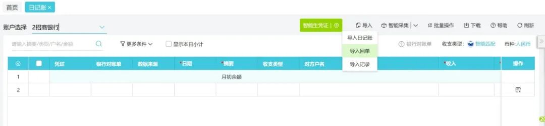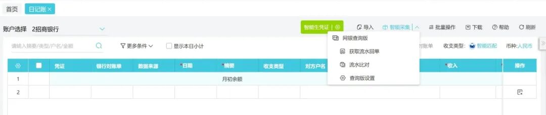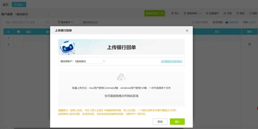 2、【銀行采集】日記賬增加智能導(dǎo)入銀行回單功能(回單PDF文件建議少于150頁(yè)),支持對(duì)全國(guó)所有銀行回單自動(dòng)識(shí)別切分,生成日記賬系統(tǒng)自動(dòng)匹配回單,日記賬生成憑證后,憑證附件自動(dòng)掛接回單可一起打??;