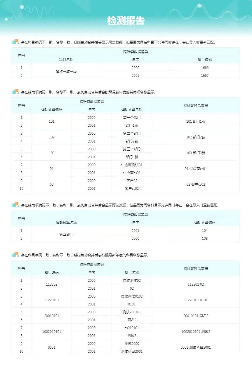 1、【賬套遷移】軟件包導(dǎo)賬多年度賬套合并功能增加合并檢測(cè)報(bào)告,便于檢查和調(diào)整不同年度科目體系問(wèn)題;