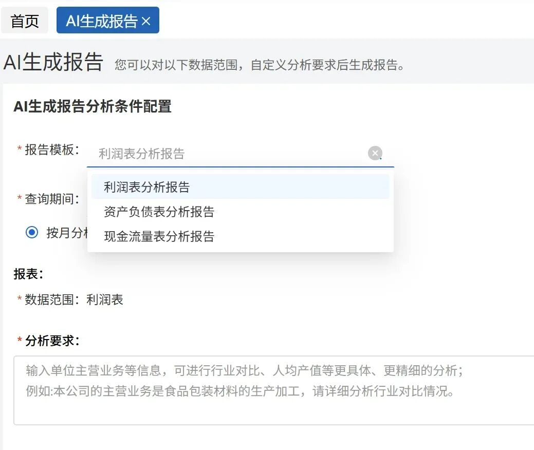 2、【AI報(bào)告】AI生成報(bào)告功能對(duì)財(cái)務(wù)數(shù)據(jù)指標(biāo)處理進(jìn)行優(yōu)化和問(wèn)題修復(fù),避免AI幻覺(jué),保留利潤(rùn)表、資產(chǎn)負(fù)債表、現(xiàn)金流量表三份分析報(bào)告內(nèi)容,可按月分析和按年分析;