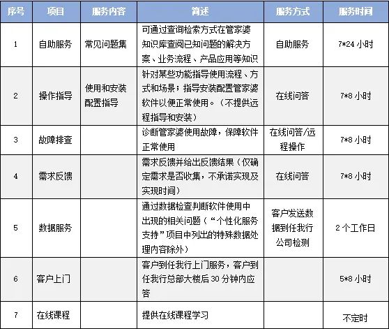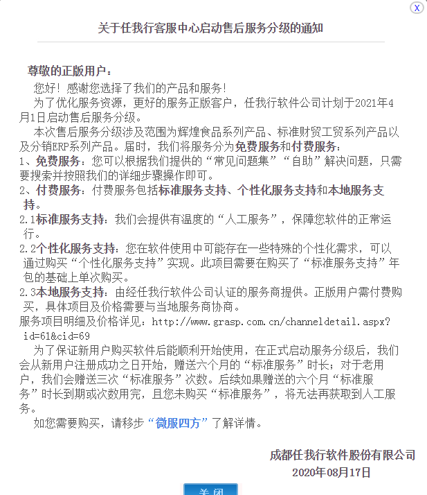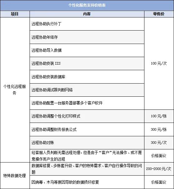 服務(wù)項(xiàng)目 服務(wù)分級(jí)分為免費(fèi)服務(wù)和付費(fèi)服務(wù): 免費(fèi)服務(wù):由任我行軟件客服中心提供??蛻舾鶕?jù)客服中心提供的“常見問題集”“自助”解決問題。 付費(fèi)服務(wù):包括“標(biāo)準(zhǔn)服務(wù)支持”、“個(gè)性化服務(wù)支持”和“本地服務(wù)支持”。 標(biāo)準(zhǔn)服務(wù)支持:由任我行軟件客服中心提供。我們會(huì)提供有溫度的“人工服務(wù)”,保障您軟件的正常運(yùn)行。正版用戶須以年為單位付費(fèi)購(gòu)買。 注:表格中5*8小時(shí)服務(wù)時(shí)間為法定工作日早上9:00-12:00,下午13:00-18:00(特殊情況會(huì)提前通知) 7*8小時(shí)服務(wù)時(shí)間為每天早上9:00-12:00,下午13:00-18:00(特殊情況會(huì)提前通知) 標(biāo)準(zhǔn)服務(wù)支持價(jià)格: 個(gè)性化服務(wù)支持:由任我行軟件客服中心提供。您在軟件使用中可能存在一些特殊的個(gè)性化需求,可以通過購(gòu)買“個(gè)性化服務(wù)支持”實(shí)現(xiàn)。必須在購(gòu)買了“標(biāo)準(zhǔn)服務(wù)支持”年包的基礎(chǔ)上單次購(gòu)買。 注:表格中5*8小時(shí)服務(wù)時(shí)間為法定工作日早上9:00-12:00,下午13:00-18:00(特殊情況會(huì)提前通知) 個(gè)性化服務(wù)支持項(xiàng)目?jī)r(jià)格: 注:客戶購(gòu)買“標(biāo)準(zhǔn)服務(wù)支持”和“個(gè)性化服務(wù)支持”,均使用正版證書編號(hào)登錄“微服四方”即可購(gòu)買。 本地服務(wù)支持:由經(jīng)任我行公司認(rèn)證的服務(wù)商提供。正版用戶需付費(fèi)購(gòu)買,由服務(wù)商與客戶協(xié)商具體項(xiàng)目及收費(fèi)標(biāo)準(zhǔn)。 特別提醒:為保證數(shù)據(jù)的完整性與連續(xù)性,用戶應(yīng)定期進(jìn)行賬套數(shù)據(jù)的備份工作,建議您每次都在硬盤上備份,并定期將備份數(shù)據(jù)拷貝至其它安全設(shè)備,相近幾次的備份數(shù)據(jù)最好不要互相覆蓋。 |