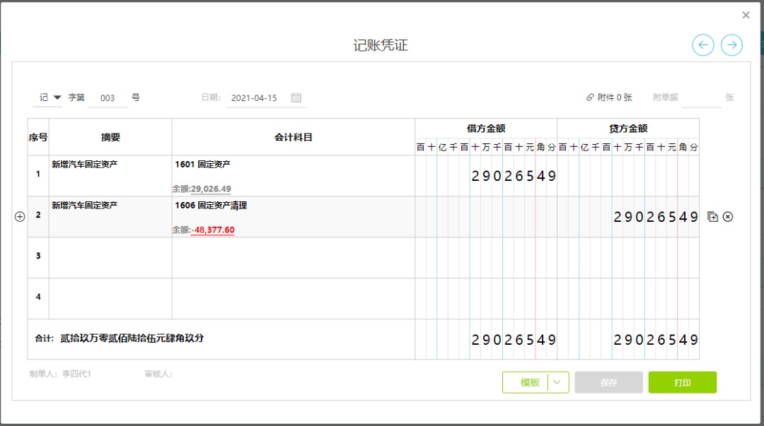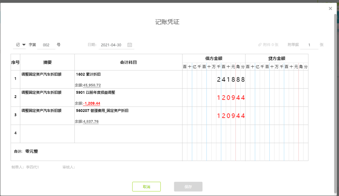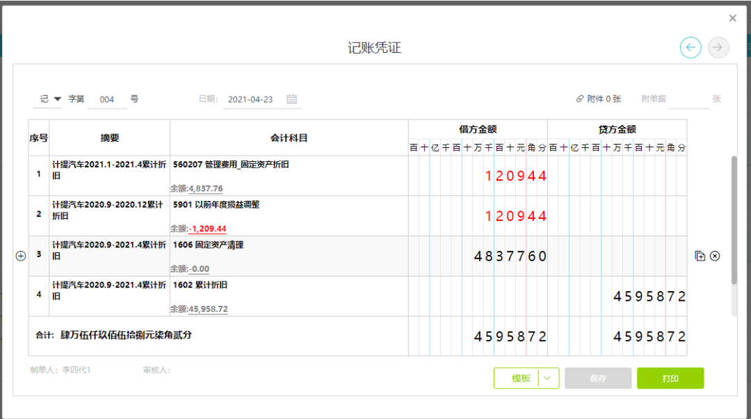 對(duì)于企業(yè)來(lái)說(shuō),沒(méi)有固定資產(chǎn)無(wú)法展開(kāi)工作,畢竟,想要開(kāi)展工作必要的工作環(huán)境以及辦公設(shè)施肯定是不能少的。固定資產(chǎn)作為企業(yè)資產(chǎn)中關(guān)鍵的組成部分,直接影響企業(yè)未來(lái)經(jīng)濟(jì)利益的流入,其初始計(jì)量和后續(xù)計(jì)量的準(zhǔn)確性關(guān)系到企業(yè)經(jīng)營(yíng)成果的真實(shí)性。然而,無(wú)論是對(duì)固定資產(chǎn)的管理和核算,還是對(duì)確定企業(yè)收入費(fèi)用的配比,固定資產(chǎn)初始計(jì)量,也就是其入賬價(jià)值確定的合理性都顯得非常重要。如果在確定入賬價(jià)值時(shí)存在問(wèn)題,企業(yè)需要及時(shí)做出相應(yīng)的調(diào)整。基于這兩點(diǎn),企業(yè)才能對(duì)固定資產(chǎn)進(jìn)行有效地管理和準(zhǔn)確地核算。 今天小編就帶大家一起來(lái)看看,以前年度固定資產(chǎn)入賬錯(cuò)誤該如何處理? 首先我們先來(lái)看下案例,本次案例中使用的軟件以好會(huì)計(jì)為例。 客戶案例 五金服寶貿(mào)易有限公司2020年8月購(gòu)入一輛公司用汽車(chē),不含稅價(jià)款290265.49元,預(yù)計(jì)使用4年,殘值率為5%,當(dāng)時(shí)錄入固定資產(chǎn)信息時(shí)未考慮殘值,導(dǎo)致折舊計(jì)提出錯(cuò),也未能及時(shí)發(fā)現(xiàn)錯(cuò)誤。2021年1月會(huì)計(jì)小劉才發(fā)現(xiàn)以前計(jì)提折舊未考慮殘值,當(dāng)時(shí)未及時(shí)做出調(diào)整。 那么利用好會(huì)計(jì)軟件如何實(shí)現(xiàn)2021年每月自動(dòng)按正確金額計(jì)提折舊的效果呢? 處理思路 五金服寶貿(mào)易有限公司2021年1-3月報(bào)表和稅費(fèi)都已申報(bào),不便于到以往年度直接修改,那么調(diào)整就只能從4月開(kāi)始,建議本月先采用固定資產(chǎn)清理,清理掉之前錄入錯(cuò)誤的汽車(chē)固定資產(chǎn),然后再重新正確錄入該項(xiàng)固定資產(chǎn)。 那么好會(huì)計(jì)是怎么處理以前年度固定資產(chǎn)入賬錯(cuò)誤的呢? 01 常見(jiàn)方案流程處理 首先要先計(jì)提當(dāng)月折舊,【結(jié)賬】-【期末結(jié)轉(zhuǎn)】選擇月份,勾選計(jì)提折舊-【測(cè)算金額】生成憑證保存即可。(或者手工在4月增加計(jì)提折舊憑證) ![]() ![]() 注:系統(tǒng)計(jì)提的折舊憑證是針對(duì)整個(gè)固定資產(chǎn)計(jì)提折舊,手工錄入只是針對(duì)某項(xiàng)固定資產(chǎn)。所以當(dāng)固定資產(chǎn)模板有多張固定資產(chǎn)卡片,系統(tǒng)計(jì)提折舊的憑證和自己手工錄入的金額就不相等。 第二步:在固定資產(chǎn)管理模板,選擇對(duì)應(yīng)月份,點(diǎn)擊清理小圖標(biāo)。 ![]() 注意:清理月份最好先計(jì)提本月折舊,且不能生成結(jié)轉(zhuǎn)損益憑證。 第三步:在變更生成憑證頁(yè)簽下,選擇月份4月,生成固定資產(chǎn)清理憑證。 ![]() ![]() ![]() 注:如不慎點(diǎn)錯(cuò)清理,可在清理當(dāng)月原位置點(diǎn)擊還原鍵還原處理,已經(jīng)生成變更憑證的需要?jiǎng)h除憑證才可以還原固定資產(chǎn)清理操作。 第四步:需在當(dāng)月新增正確的固定資產(chǎn)明細(xì),點(diǎn)擊保存,系統(tǒng)會(huì)根據(jù)購(gòu)買(mǎi)日期和錄入日期自動(dòng)算出期初累計(jì)折舊和本月折舊。 ![]() ![]() 注:年限平均法下系統(tǒng)每月折舊金額=不含稅價(jià)款*(1-殘值率)/折舊月份=290265.49*(1-5%)/48=5744.84元。 期初累計(jì)折舊計(jì)算方法=月折舊額*已計(jì)提折舊月份=5744.84*7=40,213.88元。 第五步:補(bǔ)錄固定資產(chǎn)和期初累計(jì)折舊憑證 當(dāng)月新增以前月份購(gòu)買(mǎi)的固定資產(chǎn),不能生成固定資產(chǎn)新增憑證。需要手工增加一張固定資產(chǎn)的憑證。由于該項(xiàng)資產(chǎn)為清理之前固定資產(chǎn)轉(zhuǎn)變而來(lái),故對(duì)應(yīng)會(huì)計(jì)科目選擇固定資產(chǎn)清理; ![]() 第六步:調(diào)整損益 當(dāng)月購(gòu)入的固定資產(chǎn),下月開(kāi)始計(jì)提折舊,即補(bǔ)錄的折舊憑證是2020年9月-2021年4月,8個(gè)月的累計(jì)折舊為5744.84*8=45958.72元。相應(yīng)的損益需要計(jì)提金額45958.72元。但是這個(gè)期間損益類(lèi)科目已計(jì)提6047.2*8=48377.6元。即管理費(fèi)用科目實(shí)際需要調(diào)整-2418.88元。 但因?yàn)橛?020年8月-2020年12月的管理費(fèi)用是去年的,需要通過(guò)以前年度損益調(diào)整,2021年1月到4通過(guò)管理費(fèi)用調(diào)整,剩余金額沖減固定資產(chǎn)清理。 ![]() 02 補(bǔ)充方案處理流程 固定資產(chǎn)清理科目在此只是一個(gè)過(guò)渡科目,所以最終不會(huì)有余額。也可以在做固定資產(chǎn)清理時(shí)直接修改憑證只需把相差的累計(jì)折舊計(jì)算出來(lái),去年的計(jì)提折舊分錄通過(guò)以前年度損益調(diào)整,當(dāng)年的計(jì)提折舊分錄通過(guò)相應(yīng)損益科目如管理費(fèi)用調(diào)整,也就不需要在新增固定資產(chǎn)原值憑證和固定資產(chǎn)累計(jì)折舊憑證了。 (1)補(bǔ)充方案思路 在固定資產(chǎn)模板做固定資產(chǎn)清理(按方法一第一步操作) (2)計(jì)算調(diào)整前后各需要計(jì)提的累計(jì)折舊,折舊差額,區(qū)分以前年度和當(dāng)年度的差額,在變更生成憑證頁(yè)簽下,選擇月份4月,修改生成固定資產(chǎn)清理憑證,修改憑證后保存。 
